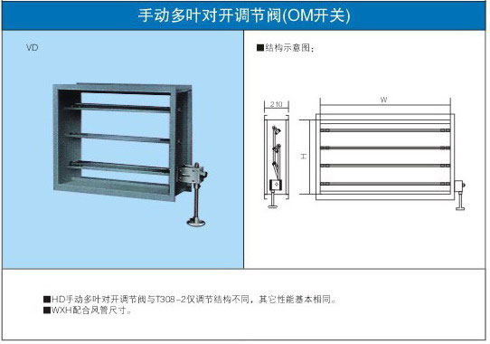 HD手动多叶对开调节阀与T308-2仅调节结构不同,其他性能基本相同