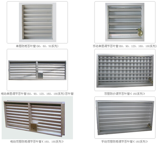 双层防雨调节百叶窗用于需通风防雨、隔热保温调节气流的机房或其他公众场合,它是由带集水沟的防雨叶片和带滴水框的侧框架组成,它不仅具有单层防雨百叶窗的优点,而且工作人员还能根据室内的温度或通风量的需求,去调节百叶窗的开度。百叶窗调节灵活、可靠,常年运行无需加油润滑,无噪音,密封性能良好。