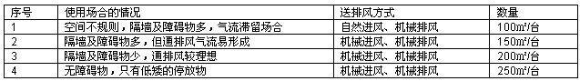 所需诱导风机的台数,在考虑通风方式(机械送排风、自然送排风、自然进风机械排风),有无隔墙,空间形状的前提下,按每台诱导风机所需要承担的面积计算,可参考下表: