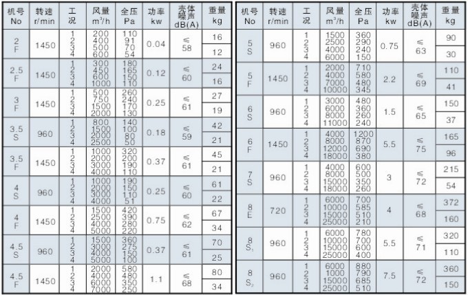 SJG钢制、FSJG玻璃钢型斜流式风机技术性能参数表